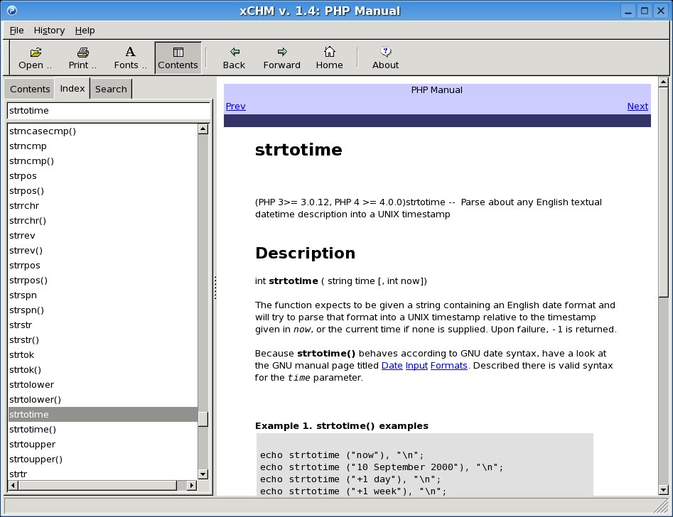 One of the things I missed on Linux was a quality .chm file viewer. I installed xCHM about year (or more) ago. I was good, but missed important features like copy/paste and Index. Well, I just tried version 1.4, and I’m delighted.